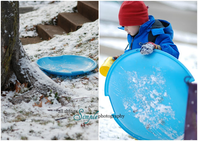 Today was a wonderful day. First, our family enjoyed some unexpected togetherness as the hubby did not have to be at work until 1pm. This was a huge blessing. We played with trains, read countless books and even ate a yummy breakfast together with no rush. I long for more days like this. After Steven left it began to snow. Preston watched eagerly from the window and kept asking if we could go outside and play. I told him that we could go outside after his sister’s nap and when more snow would pile up on the ground. Wow – he was super patient and what a blessing. We finally bundled up about 3:30pm and headed outside. Preston grabbed his sled and headed for the small hill in our front yard. Can you see the joy on his face. While Peyton didn’t want anything to do with the snow OR the camera (I held her the entire time) I captured these wonderful photos.